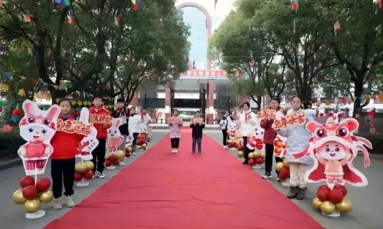 卯门生喜气,兔岁报新春。2月5日上午,常州市三河口小学以欢乐的节奏拉开了新学期的序幕。大展宏兔的红色拱门、红地毯、两边的风车和红灯笼增添了节日喜庆的色彩;飘扬的彩旗、排列整齐的迎宾小兔是对同学们回归校园的热烈欢迎。校长们热情地送上开学问候,并赠予精美的兔年许愿卡,希望他们新学期、新目标、新姿态。穿过中心大道,来到走廊,两边悬挂了上百个灯谜,考验大家智力的时候到了。这个漫长的寒假,尚美娃们可没闲着,他们在家苦练各项技能。你瞧,尚美乡村少年宫书法组的孩子正在给大家秀才艺呢!他们挥毫泼墨,书写流畅,兔年特色“福”跃然纸上。