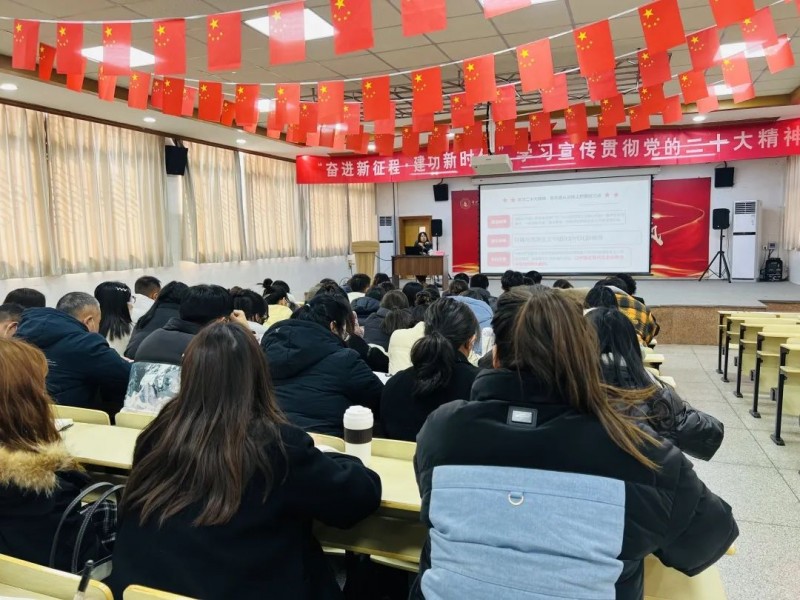 为深入落实中共常州市天宁区委组织部有关开展学习贯彻党的二十大精神"五进四见"主题活动,用党的二十大精神、习近平新时代中国特色社会主义思想武装头脑,以多种形式学习党的二十大精神、传承红色基因。我校特别邀请武进区委党校副校长、武进区委党的二十大精神宣讲团成员陆茹英进行专题授课讲座,我校党支部书记张伟,副校长赵云,党支部副书记卞黎佳,副校长高启云等校领导及全体教职工参与本次活动,会议由党支部副书记卞黎佳主持。
