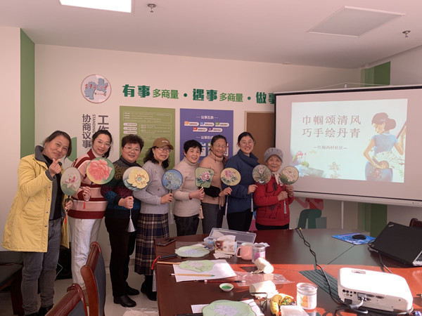 宫扇作为中华民间艺术一颗璀璨的明珠,常以丝绢为面,配以各种花卉图案,为执扇之人平添一份清雅和婉约。活动现场,常州市毗陵会刘茹老师向大家介绍了宫扇的文化背景和绘画技巧,鼓励大家发挥想象力,大胆用色。从勾线描边到层层晕染,居民们随着老师的教学步骤有条不紊地进行着创作,当有的居民不知所措无从下手时,老师总会立即上前耐心指导,现场氛围十分活跃。