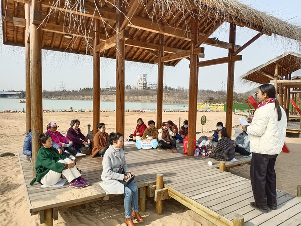 3月3日下午,在公园里,社区女职工们在志愿者的陪同下,手牵着手,一起做“认识彼此”、“讲春天里的幸福事”等小游戏,介绍自己,讲述自己的幸福体验,在分享中彼此传播正能量。