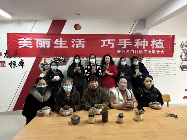 阳春三月,万象更新,在这春回大地,草长莺飞的季节,红梅街道盛世名门社区工联会组织开展“美丽生活 巧手种植——多肉DIY”活动,不断增强广大女性的幸福感、获得感、使命感。来自辖区各个企业的女同胞们围坐一起,在老师的讲解和指导下,手持小工具饶有趣味地制作多肉。大家小心翼翼地挖出小多肉,找好位置,扎根,埋土,才一会儿的时间,就有手巧的姑娘把成品端了出来,种类各异的多肉挤挤攘攘在一个花盆里,俨然是一个生机盎然的花园的样子。在工作人员的招呼下,大家纷纷举起自己满意的作品,拍照留念,留下最美的瞬间。