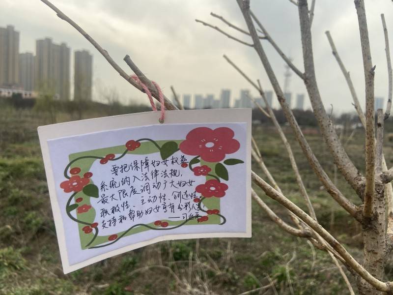 活动现场,女职工们挥锹铲土、扶苗培土、夯实土层,大家精神抖擞、干劲十足、默契配合。经过一个多小时的辛勤劳动,新种的树苗整齐排列、傲然挺立,展现出春意盎然的蓬勃生机。看到在春风里摇曳的小树苗,女职工们纷纷表示,改善生态环境、呵护绿水青山是每一位公民义不容辞的责任和义务,为绿色生态贡献自己的一份微薄之力,才是真正体现自我的价值所在。随后,大家将亲手书写的“金句卡片”挂在新种植的小树苗上,在爱绿、护绿的同时学习习近平总书记关于工会工作和妇女工作的重要论述,为我们社区工联会今后做好工会女职工工作指明了方向、提供了遵循。