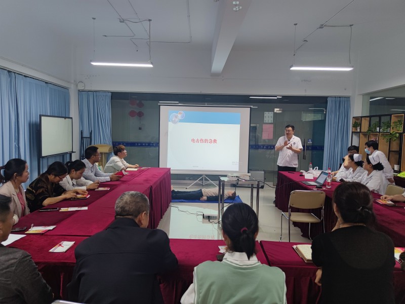 培训中,朱林镇卫生院医生就现场培训夏季高温中暑救护知识和技能,重点讲解了中暑患者的识别、紧急处理与重症中暑-热射病相关预防、救治措施,并借助模拟人对参训人员进行了心肺复苏术指导和实操演练。