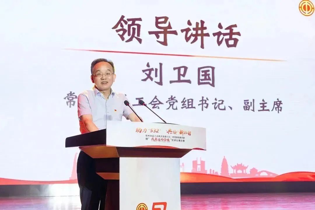 5月29日下午,市总工会机关党委与五一村党委助力“532”“共绘”新征程党建共建暨“我身边的劳模”宣讲比赛决赛,在五一村大剧院举办。市总工会党组书记、副主席刘卫国出席活动并讲话。