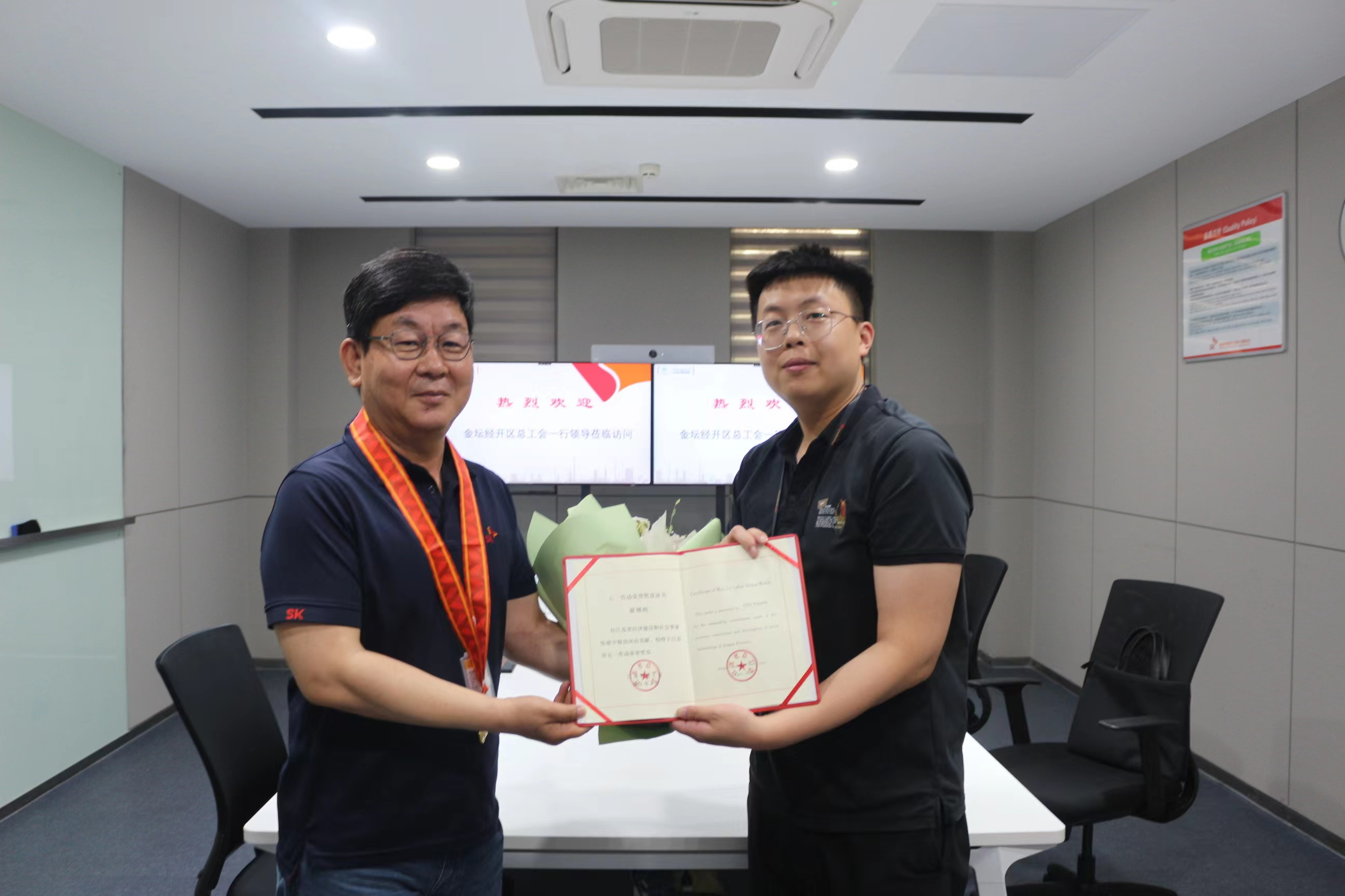 金坛经济开发区组织人事局局长、工会副主席陆思民等一行,至爱思开电池科技材料(江苏)有限公司,为崔㡕皓送去了“江苏省五一劳动荣誉奖章”奖牌和荣誉证书。崔㡕皓对金坛经济开发区总工会以及上级工会的关心表示感谢。他希望经开区工会等相关部门和公司不断加强交流,公司行政方面今后也将继续支持公司工会开展产改、员工关爱、文体活动等工作,努力打造金坛经开区外企工会工作样板。