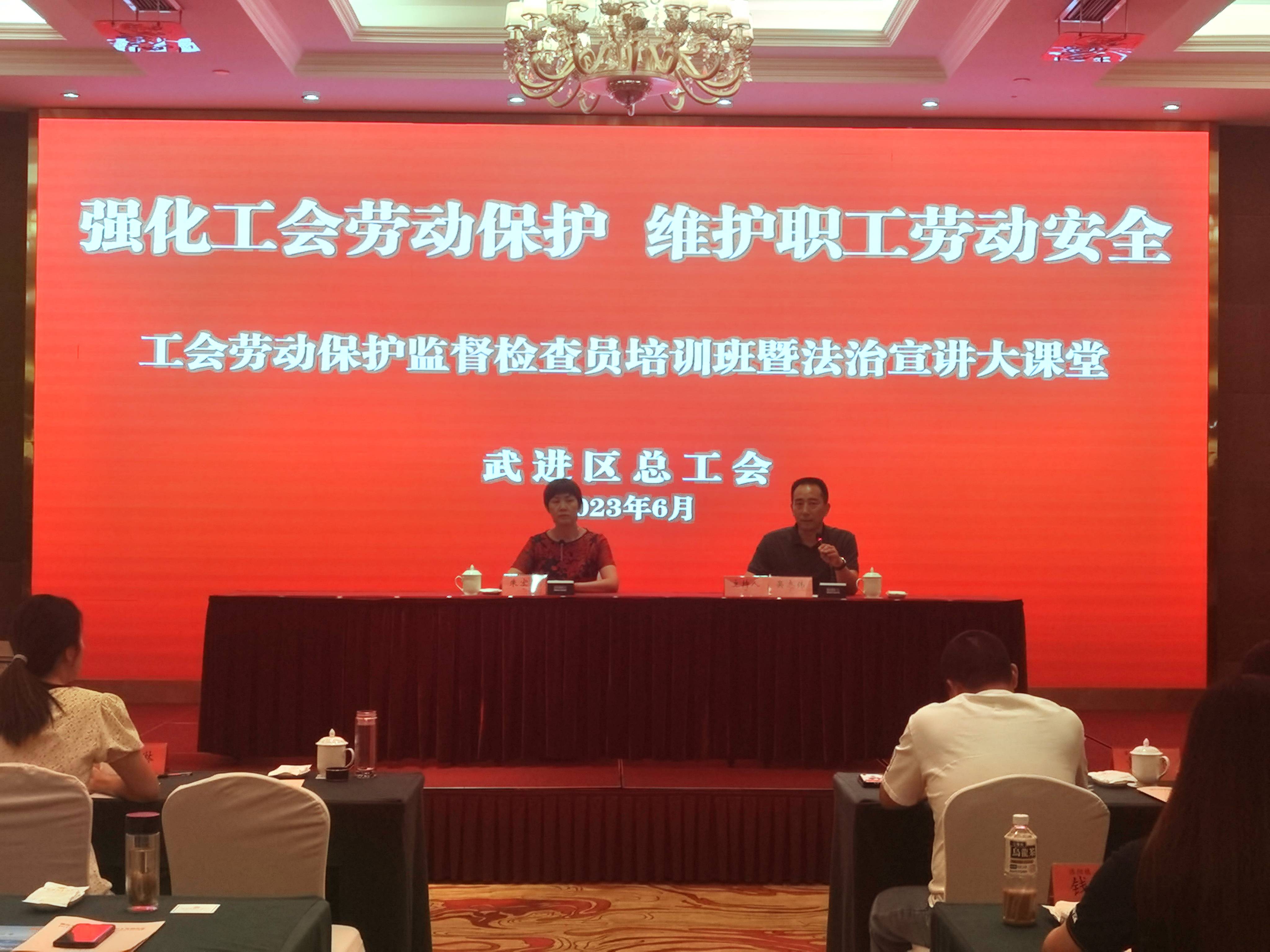6月16日下午,武进区总工会在常州市工会干部学校举办全区工会劳动保护监督检查员培训班暨法治宣讲大课堂,全区化工、冶金、建筑等90余家重点企业的工会干部、班组长、安全员等120余人共同参加了此次培训,区总工会副主席朱宏英出席开班仪式并作动员讲话,劳动和经济工作部部长吴志伟主持。