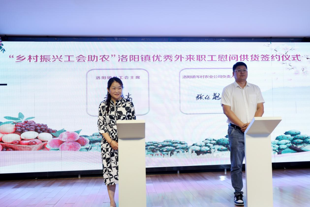 7月4日上午,“乡村振兴 工会助农”洛阳镇优秀外来职工慰问供货签约仪式在洛阳镇明珠花园酒店举行,由企业政府联手打造的洛阳镇第三届“来自魅力桃乡的问候 关爱优秀外来职工”夏日行动正式开启,活动将把从农户手中采购的优质水蜜桃送到洛阳镇优秀外来职工家属手中。