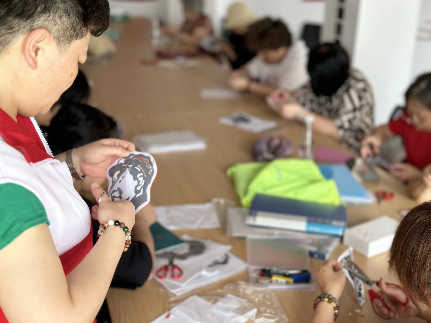 活动伊始,李美瑛详细讲解了折纸法、图案的简单设计以及剪、抠等方法和技巧。“大家看,这是肖像,大家跟着我的步骤来。”李美瑛一边展示,一边准备开工。在李美瑛的带领下,大家一边热烈讨论着剪纸的技巧方法,一边小心实践。不一会儿,一幅幅栩栩如生、惟妙惟肖、满含真情的剪纸作品在剪刀下诞生。大家相互欣赏着彼此的作品,脸上洋溢着快乐、美好的笑容。
