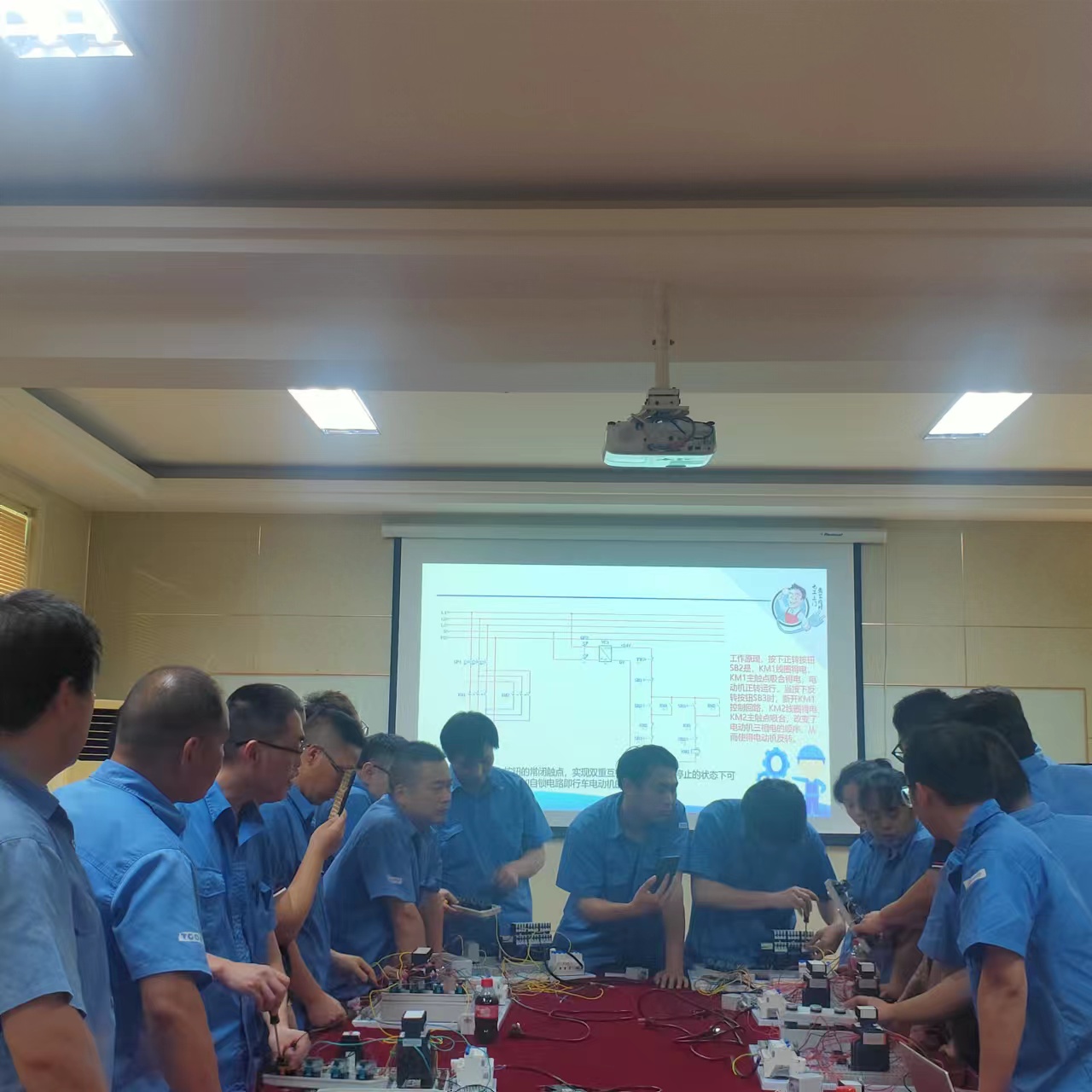 比赛前,设备管理部部长指出,理论与实操有效结合,才能提升电工团队的综合工作技能,高效完成公司安全生产的各项任务指标。电修车间办公室内的模拟实操环节,以DCS连锁控制程序操作为考题,用已有的线路连接模型上的正反转接触器,接线完成后可以单启,可互锁。要求参赛人员单人比赛在规定时间内完成最短者为基准。经过一番激烈角逐,20名选手全部完成了理论与实操的比武。