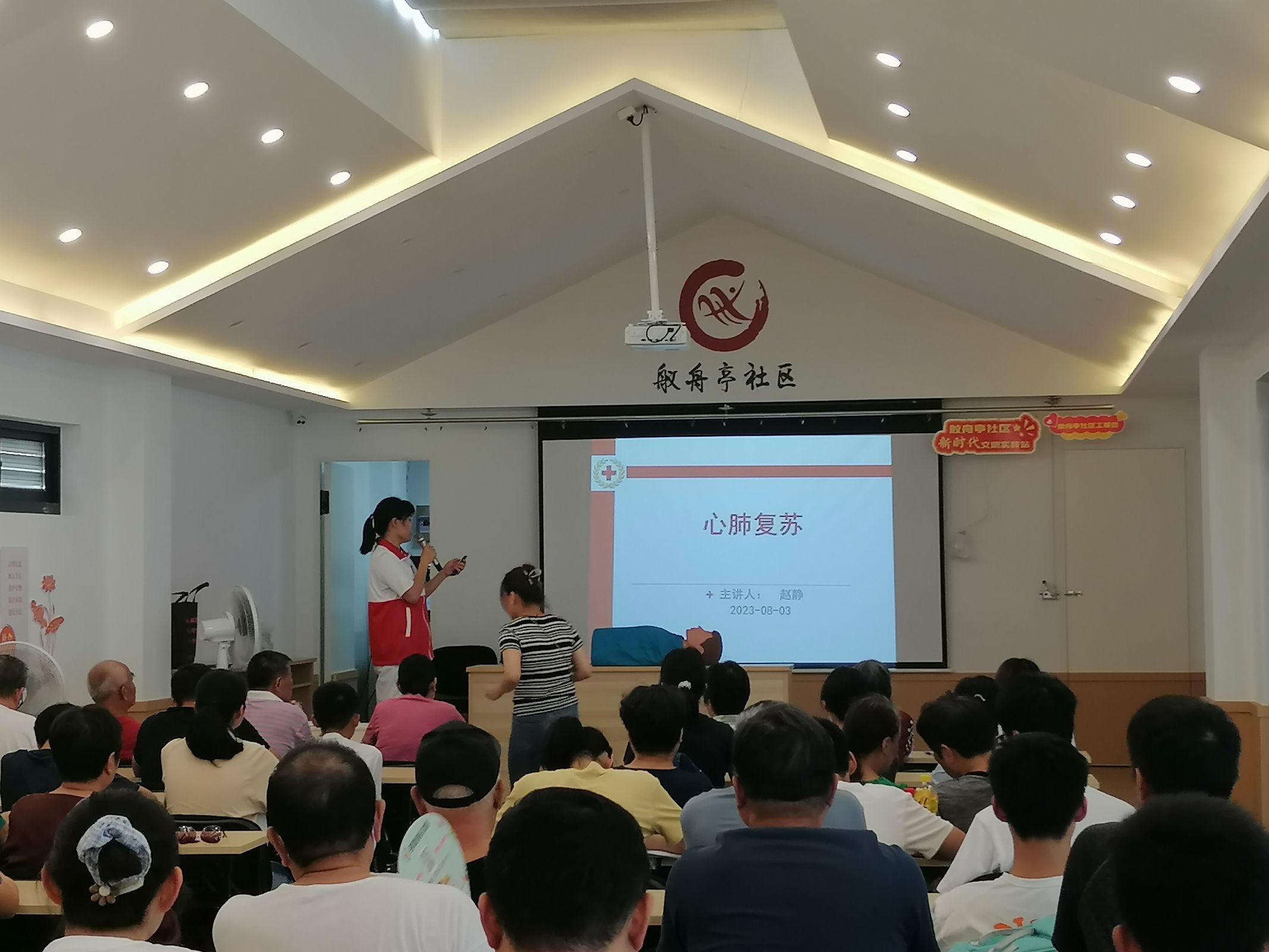 舣舟亭社区充分发挥基层党组织在基层社会治理中的引领作用,积极开展应急救护培训活动。8月3日下午两点,在桃园公寓活动室,社区工联会邀请天宁区红十字会应急救护培训师赵静,开展防溺水、心肺复苏的应急救护讲座,包括辖区单位、社区青少年、退役军人、老年志愿者在内的50余人参与现场学习。