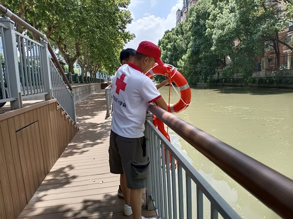 夏季是意外溺水事故的高发期,为有效防范溺水安全事故发生,8月3日,天宁区红十字会联合新丰街社区工联会在辖区关河一带河岸安装救生圈和救生绳,及时圈出防溺水安全建设“生命带”。