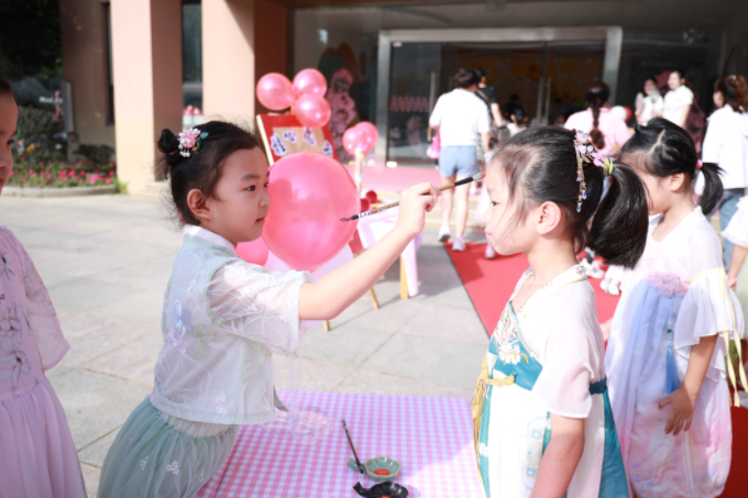 朱砂启智中园长妈妈、老师给宝贝们眉心点红,送上期许祝福;开笔添智中师幼一起手执毛笔、蘸上墨汁,郑重写下顶天立地的“人”字;击鼓传智中宝贝们手执鼓槌、以鼓明志;升国旗、班牌交接中孩子们更是体验到了成长的喜悦、满满的责任意识;最后孩子们还在摸摸吉祥物环节中收获了“聪明伶俐”“大吉大利、“平平安安”“越来越棒”的美好祝愿。