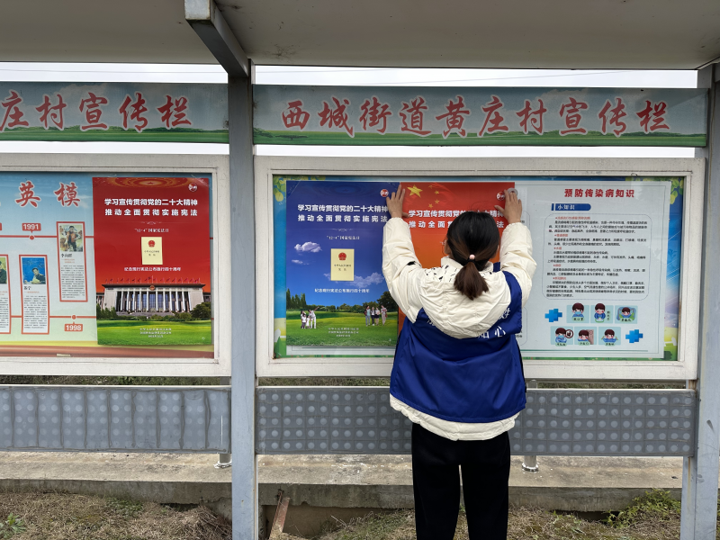 志愿者在辖区内张贴海报,并利用辖区内的LED屏开展普法宣传活动,向广大村民宣传普法标语。同时志愿者走访入户,向村民普及法律知识,发放宪法有关册子,宣传宪法与公民日常生活的关系。