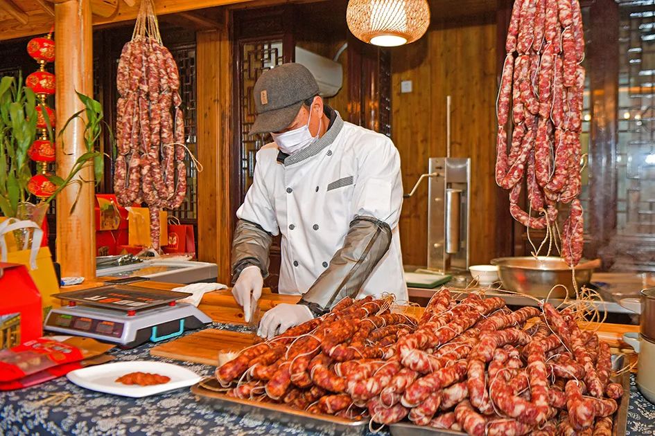 1月8日一早,焦溪老街上的“老街腊肠”已经开门营业。“进入冬月,腊肠的需求就多了起来。每天制作200—300斤,还供不应求。”焦溪腊肠市级代表性传承人莫跃技说。
