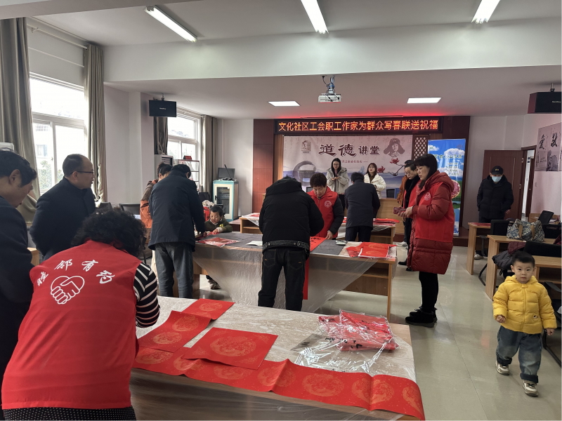 为丰富职工群众的文化生活,营造欢乐喜庆、祥和文明的节日气氛。1月17日上午,由常州市金坛区金城镇文化社区工联会主办的“挥毫送春联 墨香暖人心 迎新春 送祝福”主题文化活动顺利开展,此次活动邀请5位书法老师为群众免费写春联,把美好的祝福与浓浓的关爱送到居民手中。