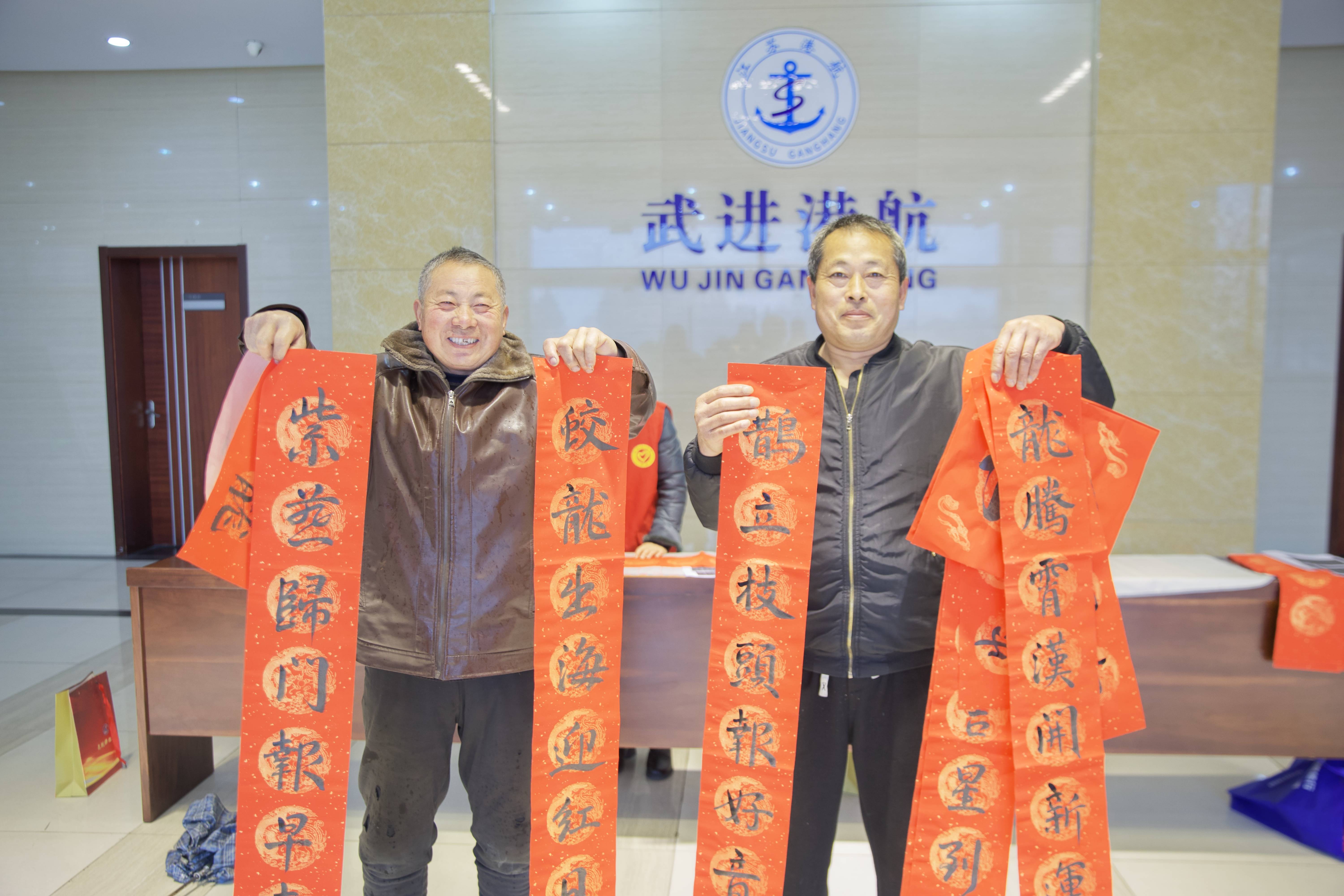 在锡溧漕河华渡水上服务区大厅内,人声鼎沸、笑语盈盈,船民们争先恐后地领取春联福字。新春佳节即将来临之际,区港航中心组织有书法爱好的志愿者们挥毫泼墨,为船民书写春联,船员们手捧春联,喜悦之情溢于言表。随后,志愿者们还来到了服务区附近的港口码头企业(常州江南混凝土有限公司),给服务对象送去了火红的福字和春联,营造出欢乐祥和的节日气氛。