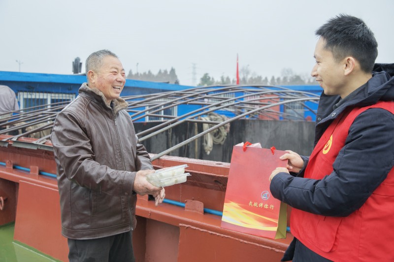 数九寒天,还飘着毛毛细雨,但在服务区的食堂里,却春意融融,暖意洋洋。一大早,志愿者们就准备好材料,包饺子、煮腊八粥,大家一片欢声笑语。随后,志愿者们走上船头,把承载着关爱和祝福的饺子送到船民手中,让长期漂泊的船民和服务对象感受这份浓情暖意。