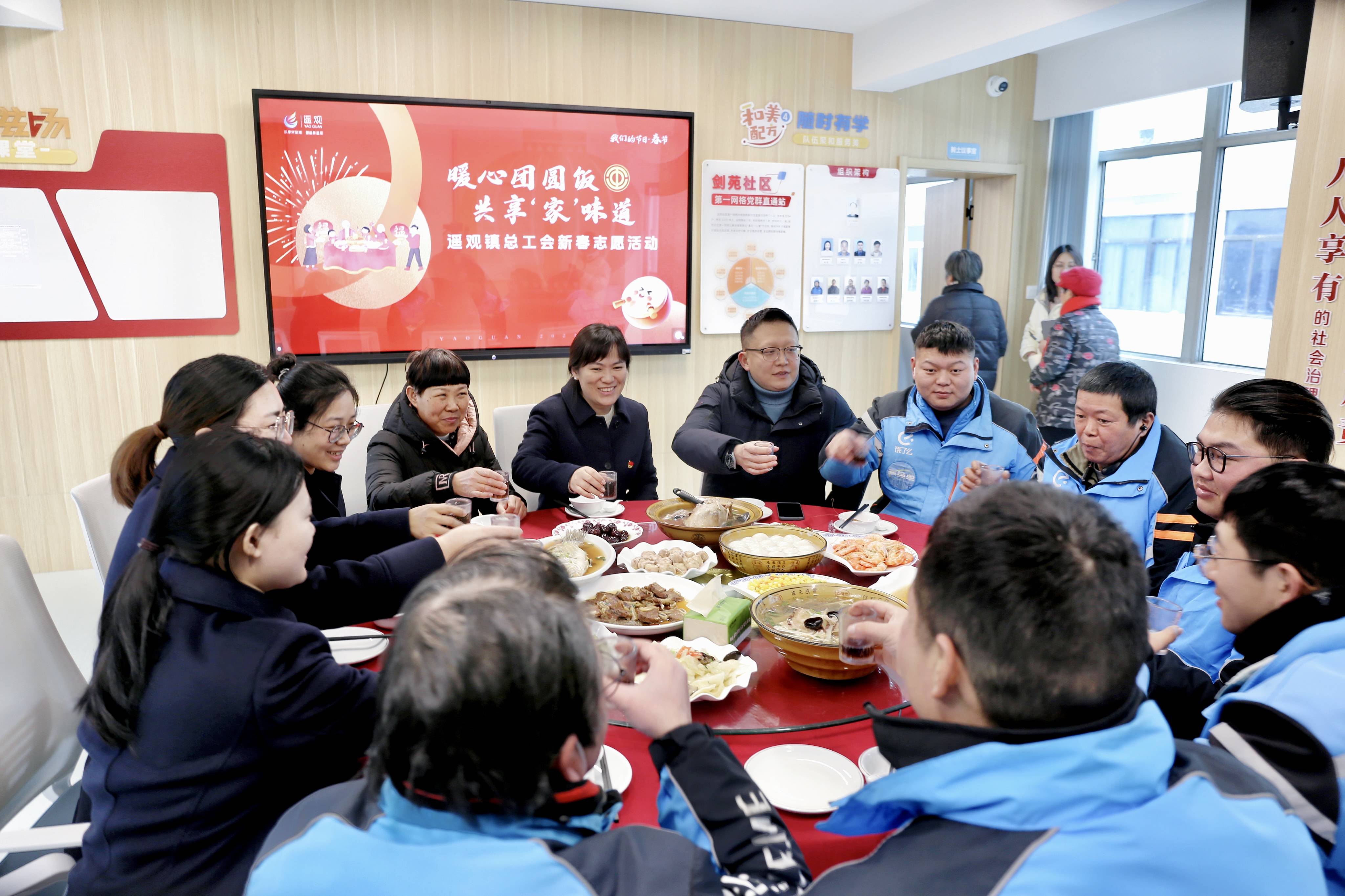 清蒸海鲈鱼、老鸭煲、清炒虾仁、松子玉米、汤圆……走进室内,一道道热腾腾的菜肴摆放在大圆桌上,飘着诱人的香气。外卖、顺丰小哥与遥观镇快递行业负责人围坐在一起,吃着暖心团圆饭、共享“家”味道。