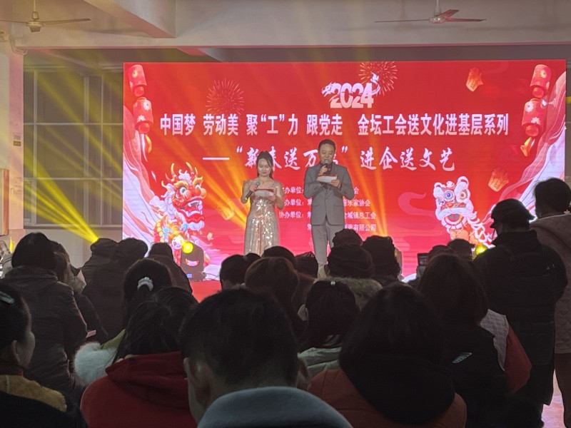 为推进文化自信自强,铸就社会主义文化事业新辉煌,持续丰富职工群众文化生活,让广大职工群众在深刻感受全面建成小康社会各项成果的同时,进一步共享文化发展成果。2月23日晚6点,由常州市金坛区总工会主办,常州市金坛区音乐家协会承办,常州市金坛区金城镇总工会和常州德源箱包制造有限公司协办的“中国梦 劳动美 聚‘工’力 跟党走 金坛工会送文艺进基层系列活动——‘新春送万福’进企送文艺活动”在常州德源箱包制造有限公司成功举办。