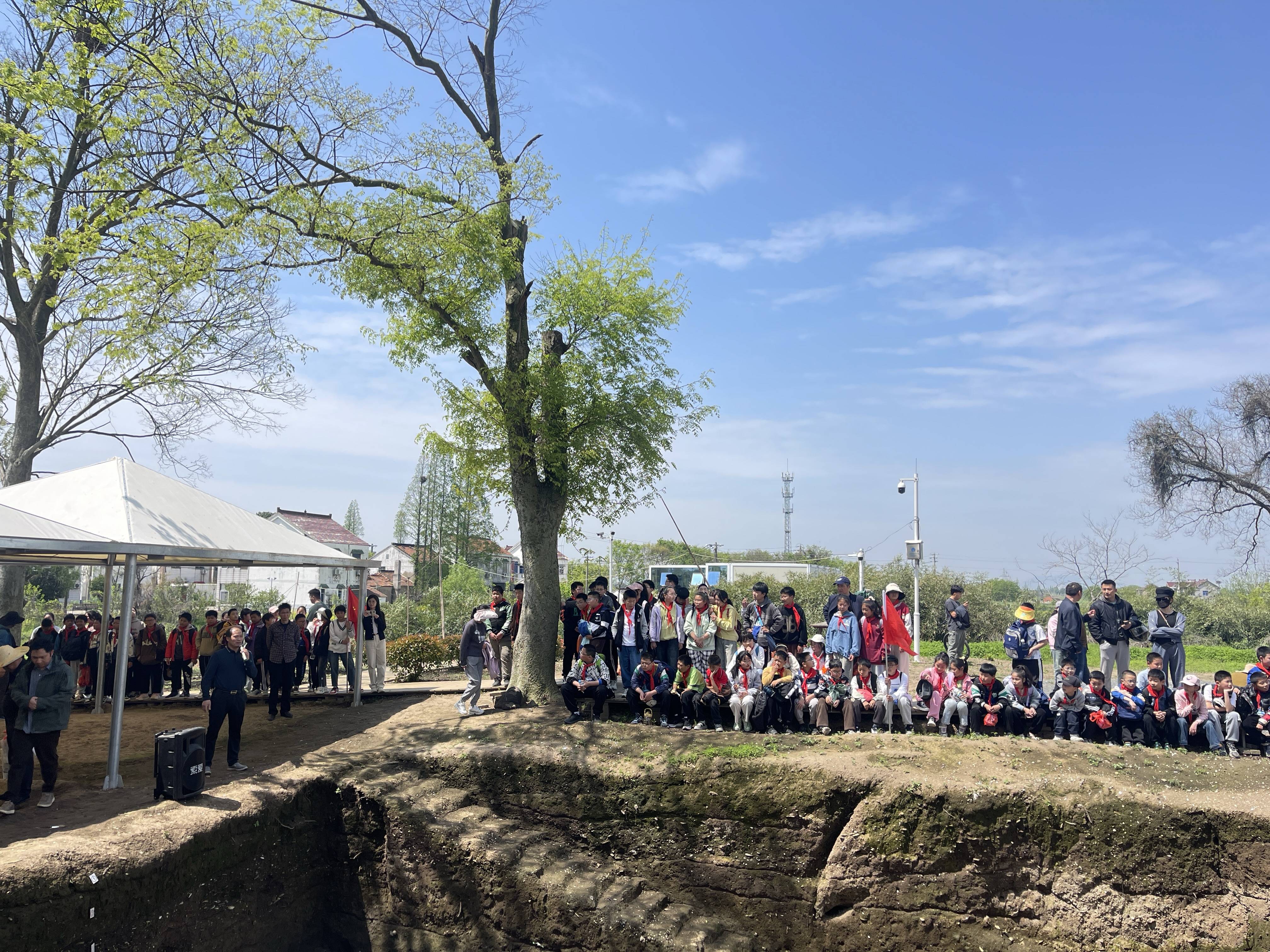 近日,常州市金坛区朱林镇三星村工会联合会携手朱林镇西岗中小学的学生们共计30名,在这片古老的土地上开启了一段少年踏古寻文明 故事滋养铸品格 为主题的赓续历史文脉、传承三星历史特别研学活动。首先,学生们在考古队讲解员的引领下,来到了遗址挖掘现场,在这里他们亲眼见到了考古队员们发掘出的房屋基址、墓葬等遗迹。通过考古工作人员的讲解,学生们了解到了远古先民的居住环境和丧葬习俗,对远古社会有了初步的认识。