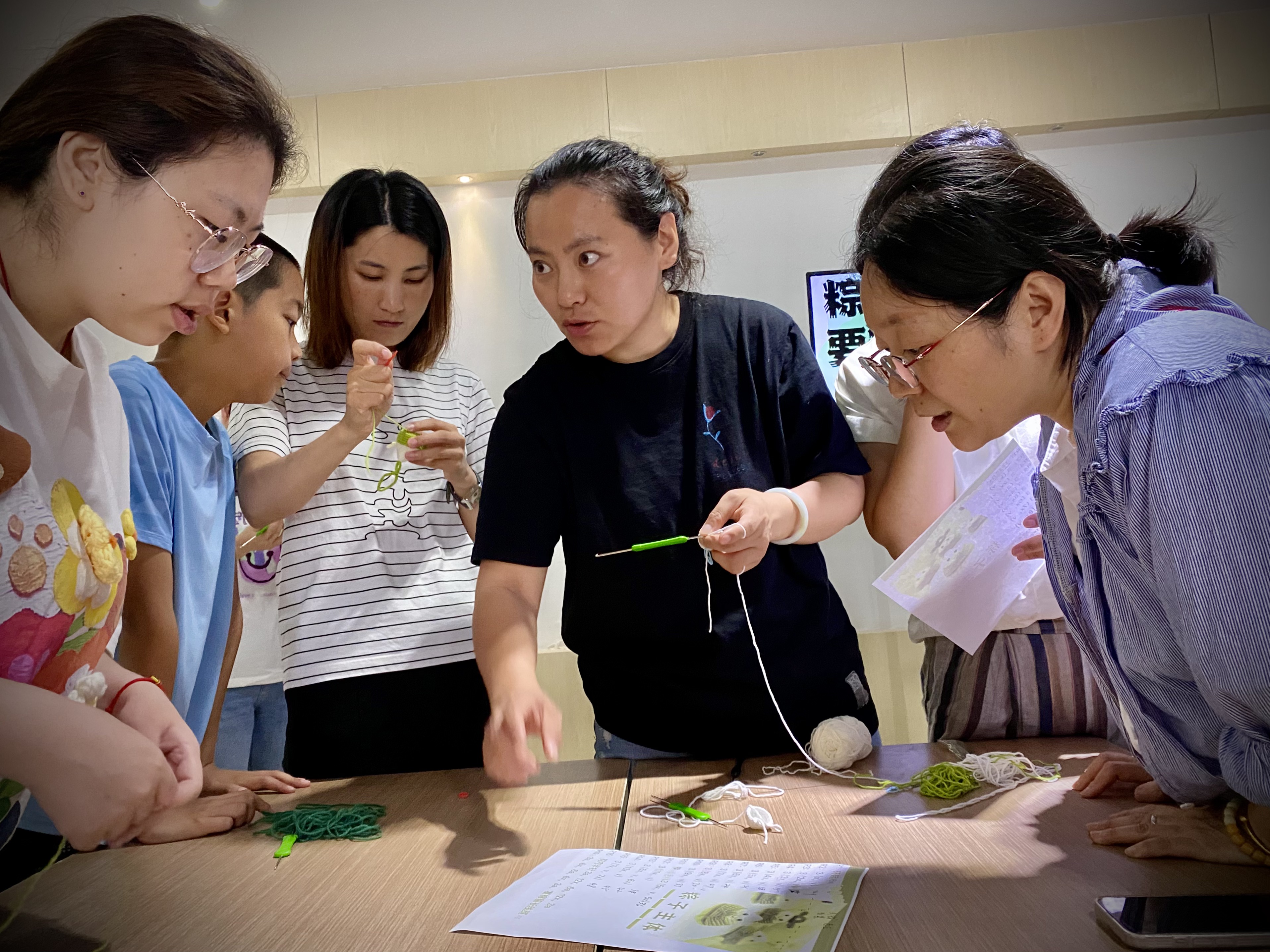 黄老师从如何挂线、起头,如何钩短针、长针等,一点一点地从基础针开始演示。大家随着老师的讲解演示动手操作,互帮互学,反复练习。看着自己的作品一点一点成型,大家心里乐开了花,成就感爆棚。