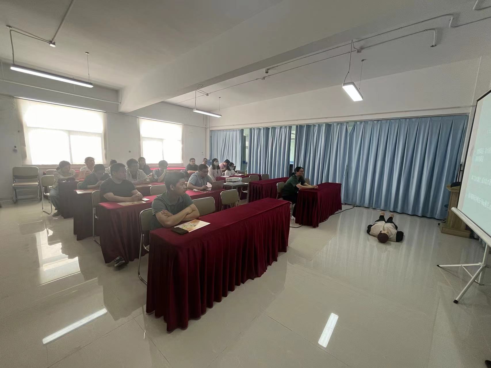 此次培训采取“理论培训+实际操作”的模式,特别邀请到朱林镇卫生院的培训老师为大家讲解如何应对常见突发事件和意外伤害现场,重点解析红十字运动基本知识、心肺复苏和AED操作、创伤救护基本技能(止血、包扎、固定、搬运)等,并为学员现场演示正确的操作步骤。