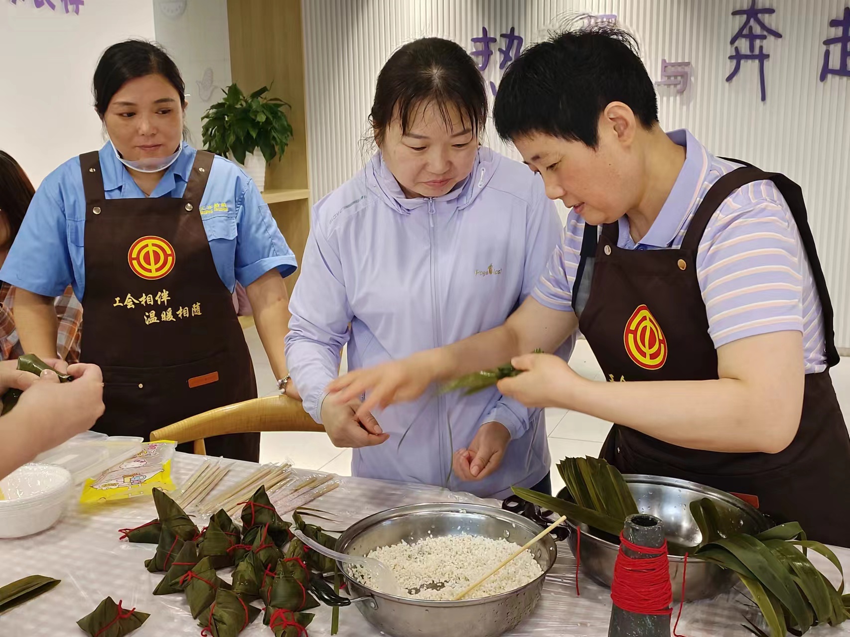 菖蒲寄意,粽叶飘香,又是一年端午到。在选手比赛过程中,现场观众已加入到包粽子的特色活动中。卷、装、折、捏、捆,一个个清香糯甜、松软适中的粽子把棕叶的清香、米的馥香融为一体。职工们在制作中感受快乐,在交流中碰撞思想火花。包好的粽子也打包完毕,送到了7位困难职工的手中。