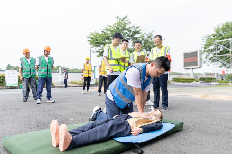 本次竞赛包含五个项目:五点式高空安全带穿戴、防汛沙袋的装填和堆放、消防灭火器使用、消防水带使用、紧急救援心肺复苏。