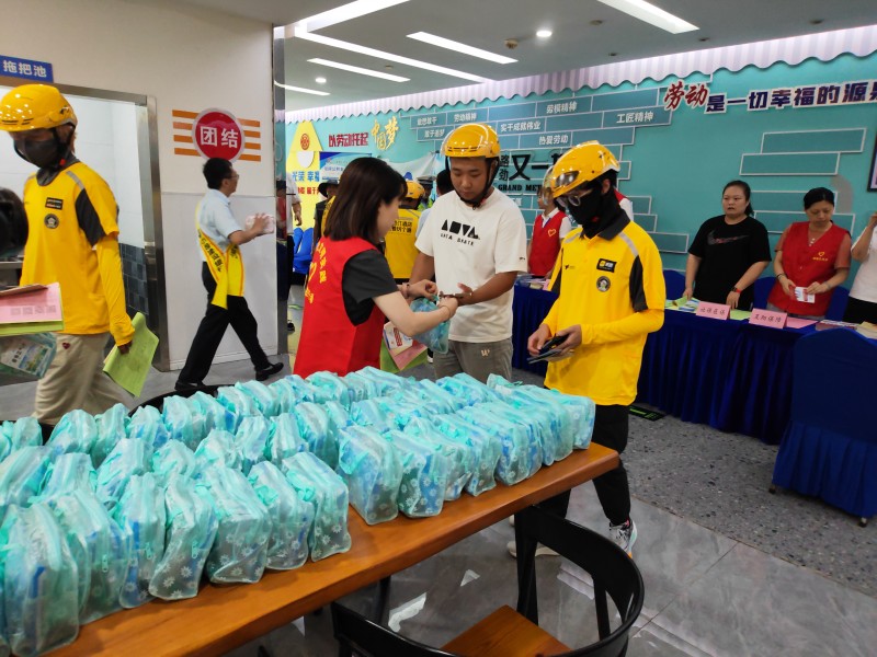 龙城出梅,高温接档。为了更好地关心关爱户外劳动者,7月16日上午,湖塘镇总工会“吾湖安康 夏送清凉”系列活动在路劲又一城工会驿站拉开帷幕,站点周边百余名快递员、外卖员、环卫工人、商场保洁员、保安等新就业形态群体拿到了冰爽的酸梅冷饮和贴心的降温清凉包,让他们在闷热的夏日感受来自“娘家人”的关心和关怀。