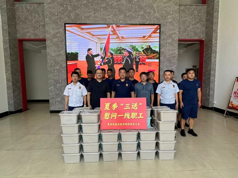 炎炎夏日,烈日酷暑。盛夏的高温“烤”验着每一个户外作业的职工,大家顶着酷暑,奋战一线,毫不懈怠。为有效预防和控制职业性中暑事件,保障高温作业及高温天气下劳动者的健康权益,7月31日-8月1日,常州市金坛区东城街道党工委副书记、总工会主席朱丹俊,东城街道办事处副主任兼综合行政执法和安全生产监督管理办公室主任陈钰,东城街道党工委委员、宣传委员、统战委员王璐,东城街道总工会副主席张国勇带队,先后前往城东建设、良常物流、申通快递、园林酒店、东城派出所、东城交警、消防大队等14家企事业单位为坚守岗位、奋战一线的职工送去清凉与工会的关怀,在炎炎夏日中为职工撑起“防暑遮阳伞”。