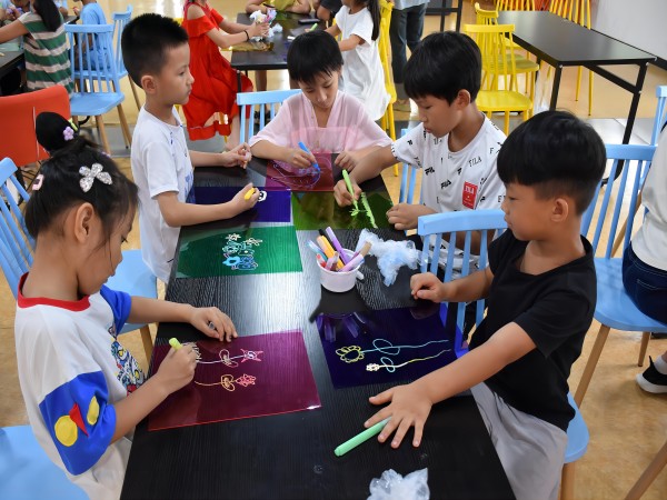 然后,是玩具屋《光影》亲子合作手作环节,这是一个充满创意与温馨的过程。家长和孩子们各司其职,共同创作出了一件件独一无二的艺术品。家长运用美工刀精准地切割KT板,为作品打下了坚实的基础;孩子们则在七彩PVC玻璃纸上尽情挥洒想象力,用丙烯颜料笔绘制出“亲人”“花朵”“梦想”等充满温情和希望的图案。这些图案不仅展现了孩子们天真烂漫的内心世界,也寄托了他们对未来的美好憧憬。最后,家长用胶枪将孩子们的作品巧妙地黏贴在KT板上,一件件充满爱的光影作品便呈现在大家眼前。这些精美的作品之后将会被用来装饰儿童玩具屋的大玻璃,这不仅是一场简单的亲子互动活动,更是助力社区青少年儿童家庭健康快乐发展的志愿行动。