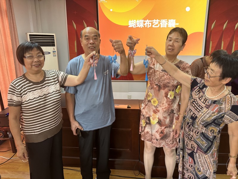 在制作过程中,大家相互交流、互相帮助,气氛十分融洽。居民们凭借着丰富的生活经验,手法娴熟地完成着一个个精美的香囊。不一会儿,一只只形态各异、栩栩如生的蝴蝶布艺香囊便在大家的手中诞生了。
