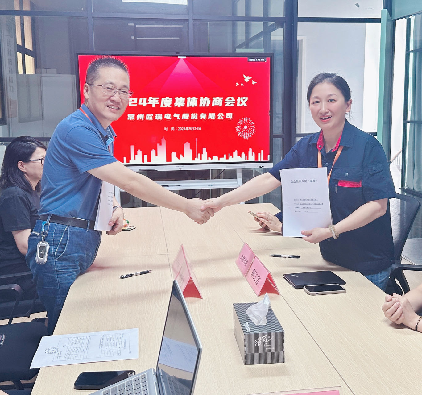 经过深入协商,双方就职工最迫切诉求达成了共识,确定了2024-2026年度职工平均工资标准、工资增长幅度、高温津贴标准、夜班补贴等,并签署了《欧瑞电气2024年度集体合同(草案)》,体现了企业对职工利益的重视和关怀,也为构建更加和谐稳定的劳动关系奠定了坚实的基础。