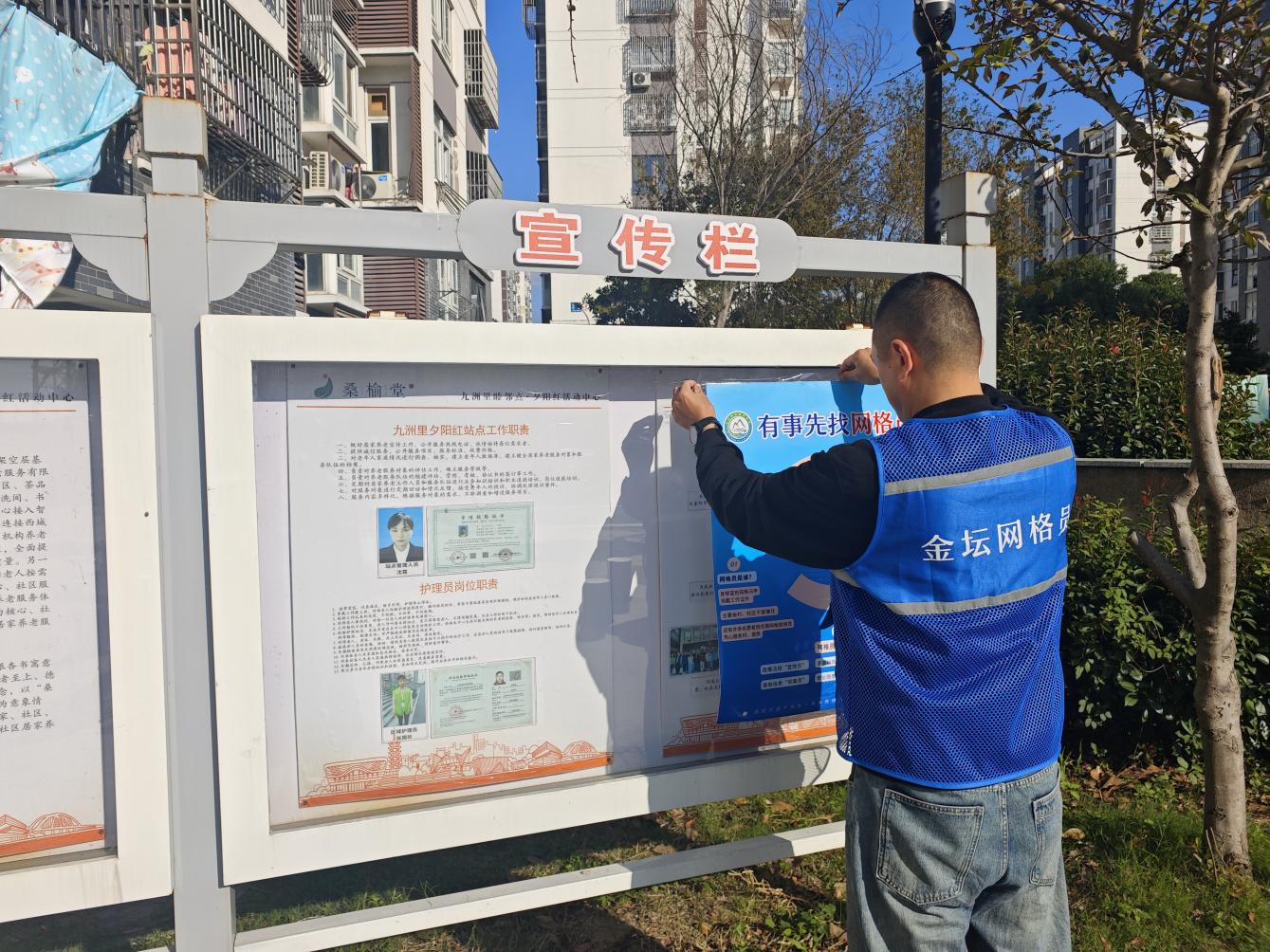 活动中,网格员们身着统一蓝色马甲,手持“有事先找网格员”的宣传海报,穿梭在社区的每一个角落。他们耐心地将海报张贴在显眼的位置,如社区公告栏、小区宣传栏等,确保每一位居民都能看到并了解网格员的存在和作用。