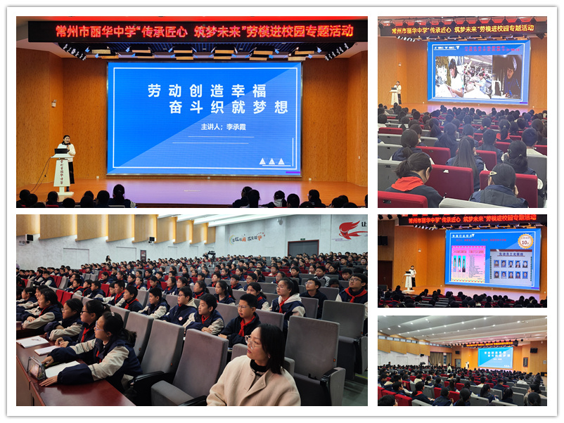 为进一步弘扬劳模精神、劳动精神、工匠精神,充分发挥劳模工匠的示范引领作用,教育和引导学生树立正确的价值观,增强辛勤劳动、诚实劳动、创造性劳动的观念。11月22日下午,由常州市天宁区茶山街道总工会组织的“劳模工匠进校园”活动在常州市丽华中学举行,学校有关领导以及师生代表参加活动。全国劳动模范李承霞分享了自己的奋斗历程和人生感悟,她在平凡岗位上不平凡的劳动故事,深深感动着在场的师生们。