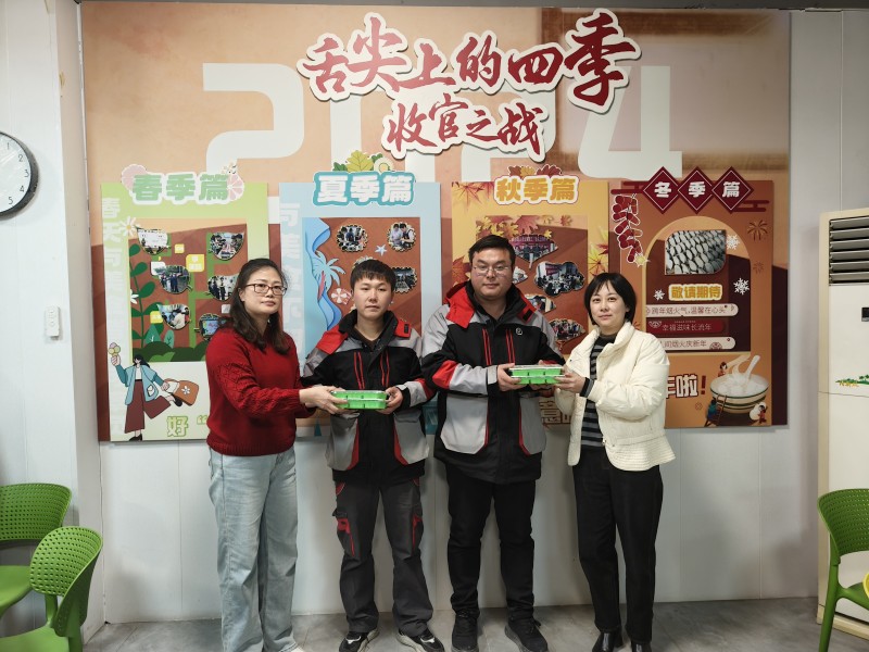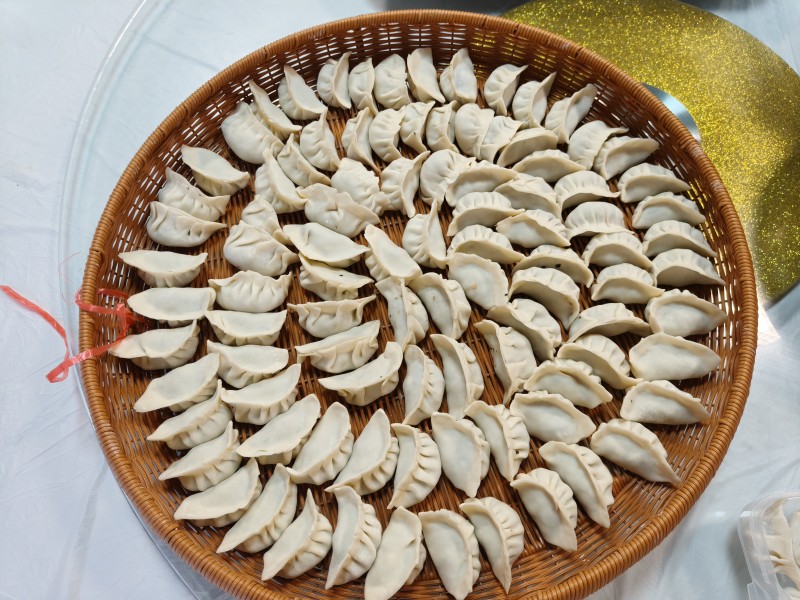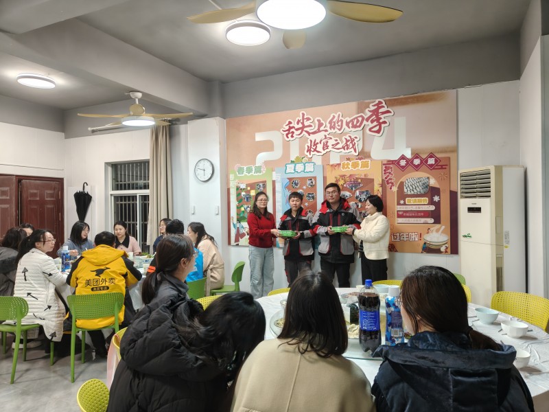 活动现场,热闹非凡。职工们齐聚一堂,纷纷挽起袖子,化身包饺子小能手。桌上摆满了新鲜的食材,有翠绿的葱花、鲜嫩的青菜、饱满的肉馅,散发着诱人的香气。经验丰富的职工手法娴熟,包出的饺子形状精美,宛如一个个小巧的艺术品。而那些不太熟练的职工也不甘示弱,认真地学习着包饺子的技巧,虽然包出的饺子形状奇特,但却充满了趣味。大家一边包饺子,一边分享着冬至的习俗和生活中的趣事,欢声笑语回荡在整个社区食堂。随着一盘盘饺子下锅,热气腾腾的氛围更加浓厚。当煮好的饺子端上桌时,大家围坐在一起,品尝着自己亲手包的饺子。