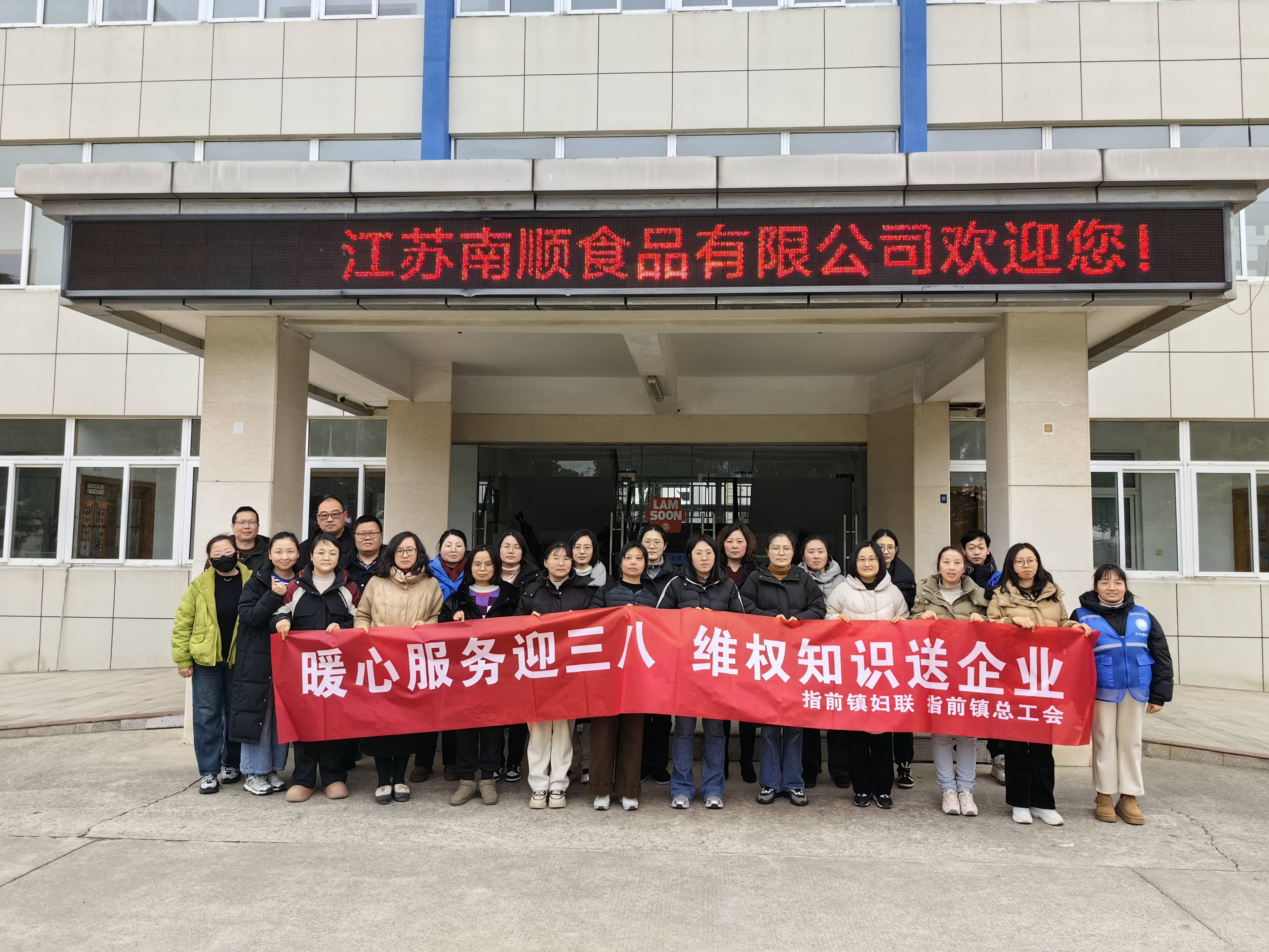 在“三八”国际劳动妇女节来临之际,常州市金坛区指前镇总工会联合镇妇联走进江苏南顺食品有限公司,开展了“暖心服务迎三八 维权知识送企业”活动,为企业女职工送去节日的关怀与温暖。