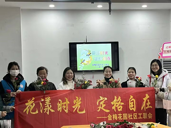为庆祝国际劳动妇女节,丰富辖区女性文化生活,展现女性独有的魅力与风采,3月5日,金梅花园社区工联会举行了“花漾时光 定格自在”主题插花知识培训及艺术实践活动,并为辖区商铺女性从业者们送上节日鲜花与祝福。