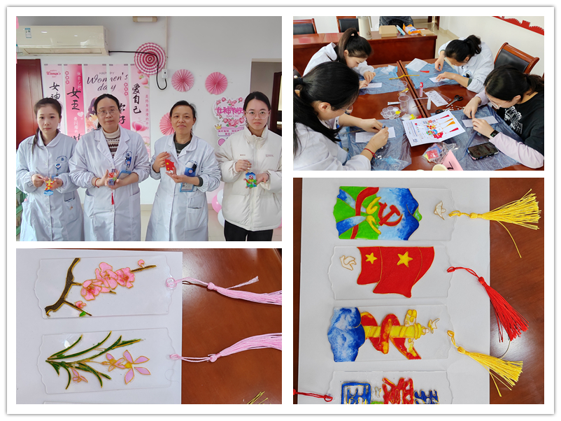 活动现场气氛温馨欢快,女职工们时而专注描绘图案,时而低声交流技艺。慢病科的刘冰初次尝试掐丝工艺,在团队成员的帮助下顺利完成竹节造型:“原本以为金丝定型最难,没想到在大家的协作下,复杂的工序变得充满乐趣!”随着一件件流光溢彩的书签作品逐渐成型,工会设立的“创意展示角”成为最热闹的区域。有的书签在竹叶间隙镶嵌贴片,有的在“我爱中华”字样旁点缀白玉兰浮雕,传统非遗文化在这里焕发出新时代的灵动表达。中医科科长时洁感慨道:“看着彩砂在集体创作中变成艺术品,就像见证平凡生活中绽放的光芒。”