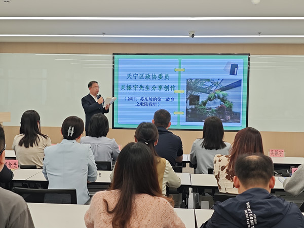 活动现场,竹林社区工会联合会特别邀请民革常州市委理论研究和祖统工作委员会副主任委员、天宁区政协委员吴振宇先生,分享他创作的《乡归:苏东坡的第二故乡之毗陵我里》。吴振宇先生用细腻笔触,探寻东坡先生与常州的不解之缘。书中以详实史料和生动描写,还原了苏东坡与常州“眷此邦多君子”的千年情缘,更以“试问岭南应不好,却道:此心安处是吾乡”的东坡精神,诠释新时代“家”的文化内涵。