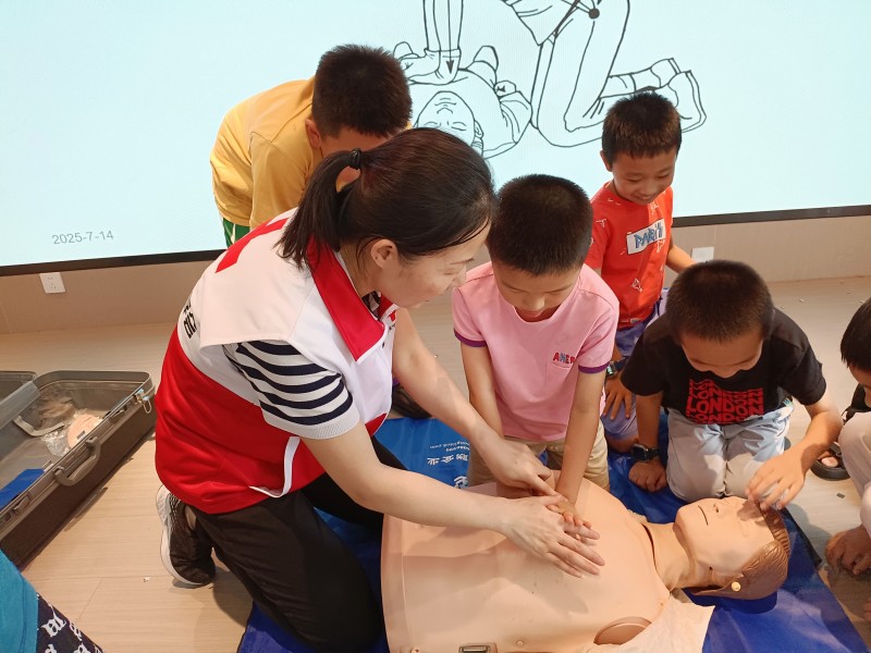“当有人晕倒失去意识,黄金4分钟的心肺复苏能为生命争取时间。”急救老师围绕“心肺复苏”和“气道异物梗阻”两大常见紧急情况向孩子们进行讲解,结合生动案例、直观视频和现场模拟,用通俗易懂的语言传授急救要点与步骤,青少年们听得格外认真,不时举手提问。实践环节,急救老师邀请青少年上台模拟操作,让他们在实践中加深对急救技能的掌握。