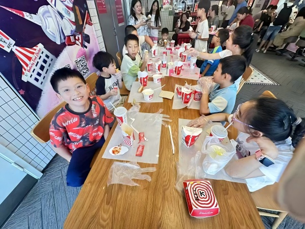 当一个个歪歪扭扭却充满心意的汉堡完成时,孩子们举着自己的“作品” 欢呼雀跃,有的还非要跟旁边小伙伴的汉堡比一比谁的更漂亮。咬下第一口时,满足的喟叹声此起彼伏:“我做的汉堡最香!”“原来上班这么有意思呀!”