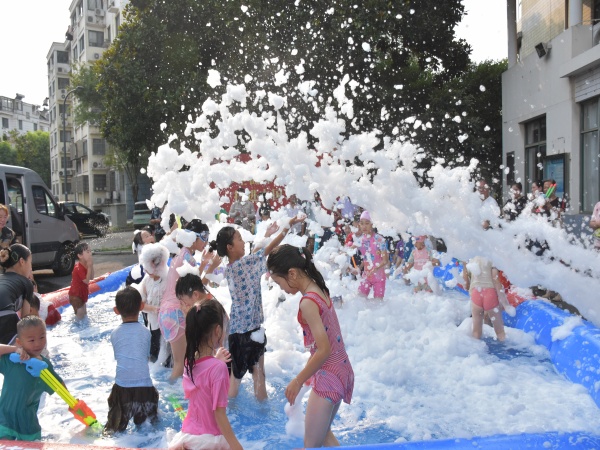 活动现场,巨大的充气水池成为孩子们的欢乐海洋。社区提前布置好场地,启动泡泡机,大量绵密泡泡不断喷涌,瞬间将水池变成梦幻世界。孩子们身着泳衣,迫不及待踏入水池,有的手持水枪互相“射击”,水花四溅中笑声不断;有的在泡泡堆里尽情打滚、抓取,让白色泡泡沾满全身,享受沉浸式玩水乐趣。家长们在旁全程陪伴,用镜头记录孩子纯真笑脸,偶尔也参与“水战”,与孩子互动,现场洋溢着温馨欢快的气息。