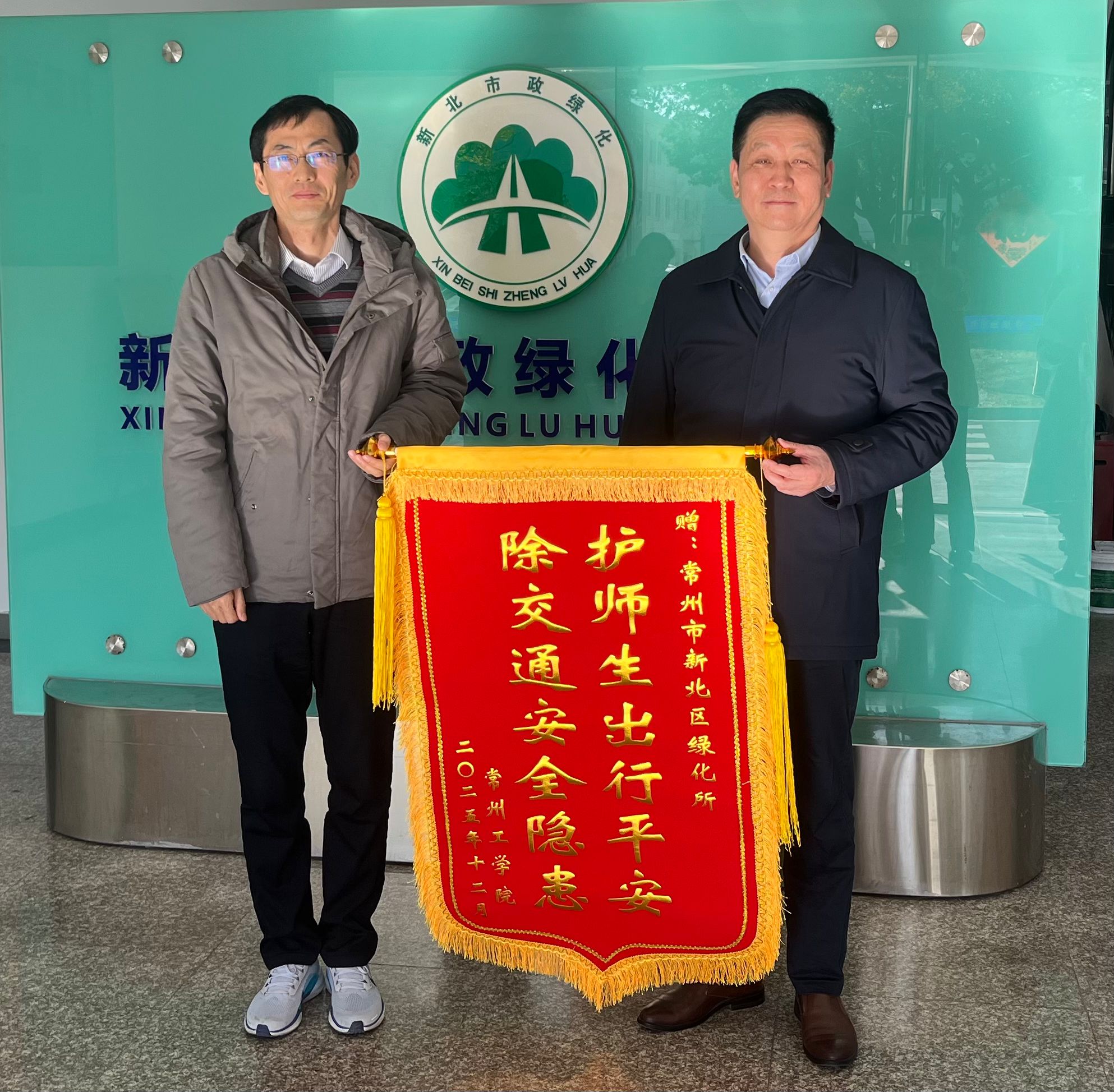 12月3日下午,常州工学院工会主席章志荣一行专程前往新北区市政绿化管理所,送上写有“护师生出行平安 除交通安全隐患”的锦旗,对该所快速响应诉求、优化校园周边路段绿化、消除交通安全隐患的举措表示诚挚感谢,并与该所就后续校园周边环境提升与合作拓展达成初步共识。