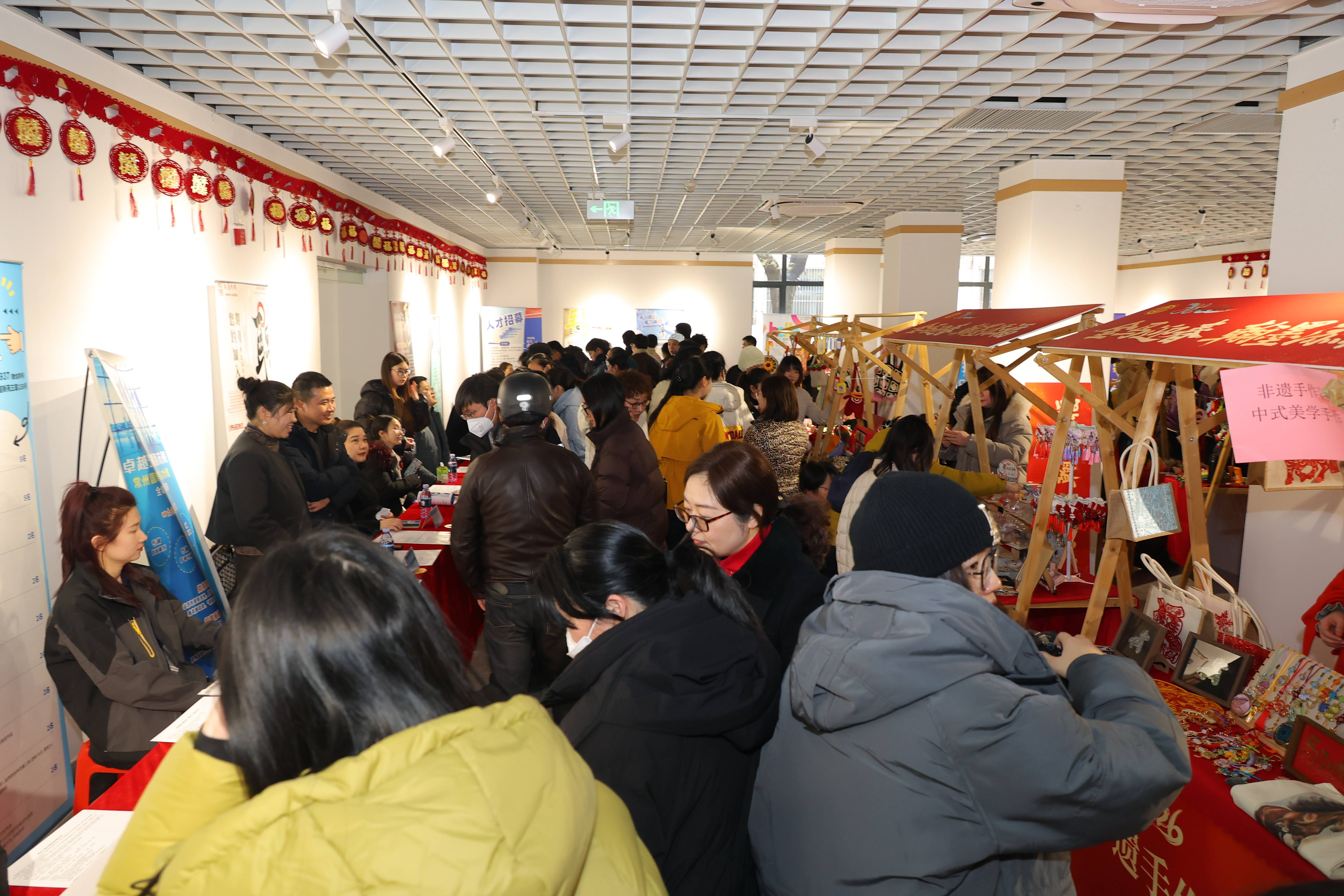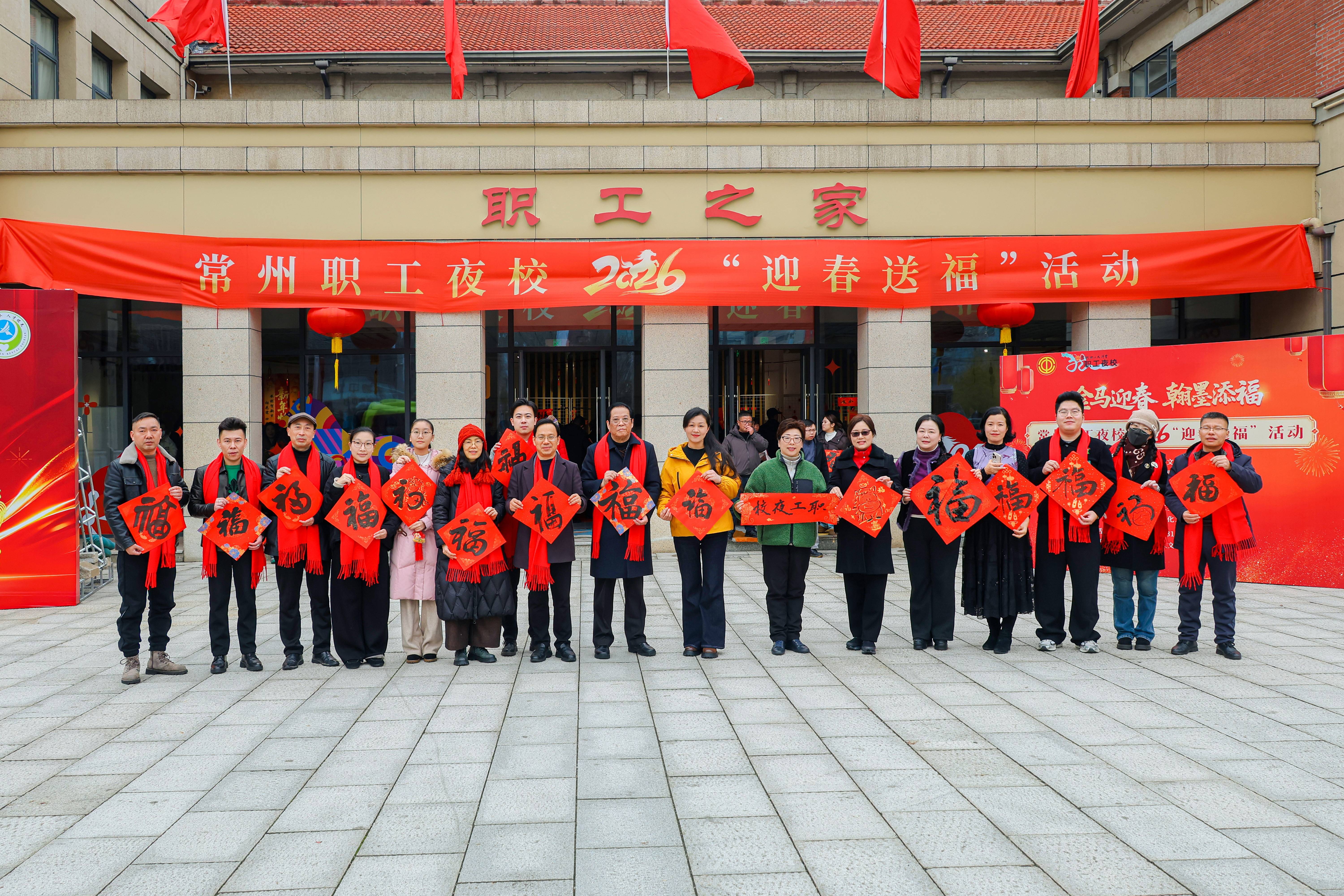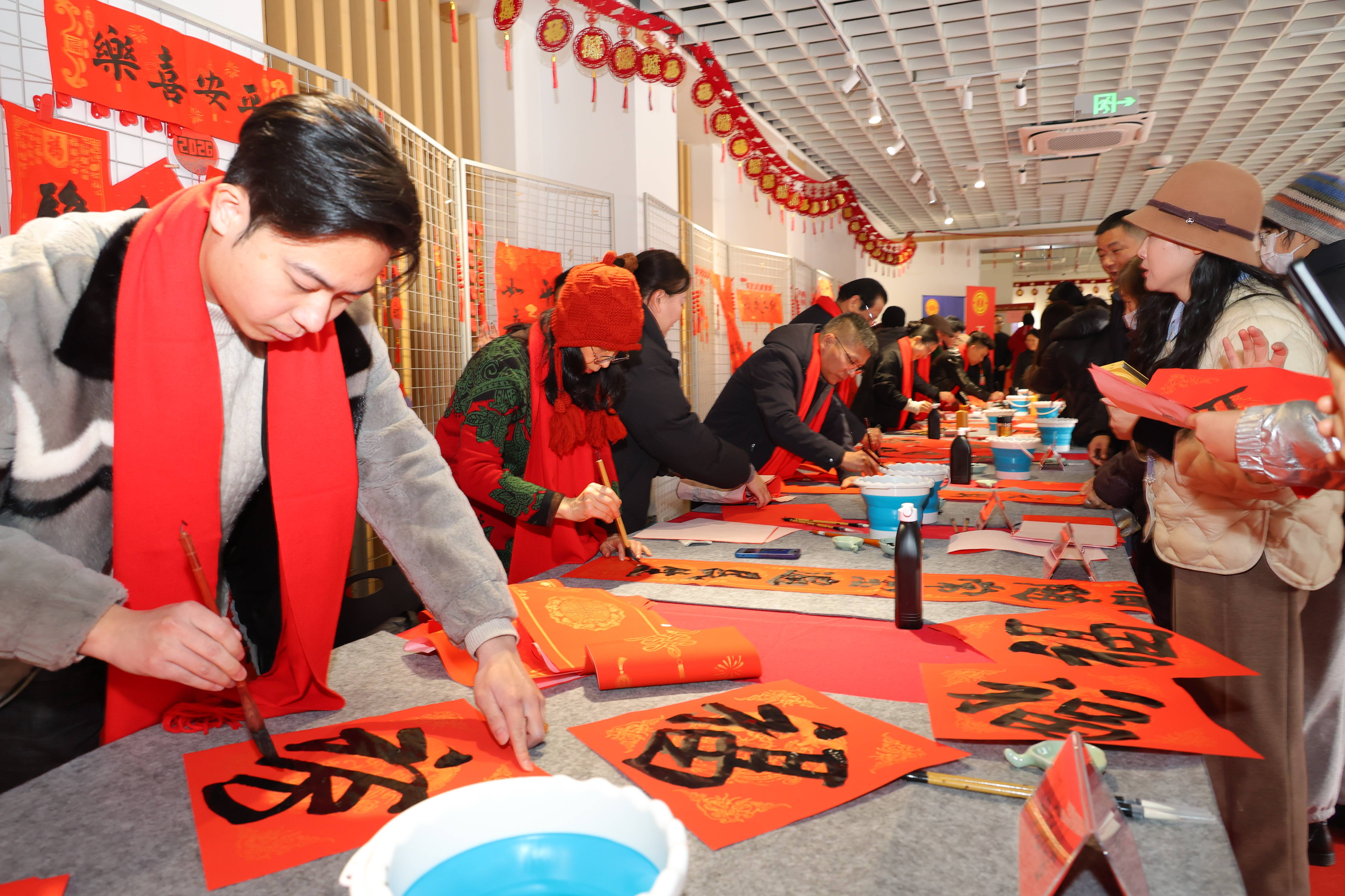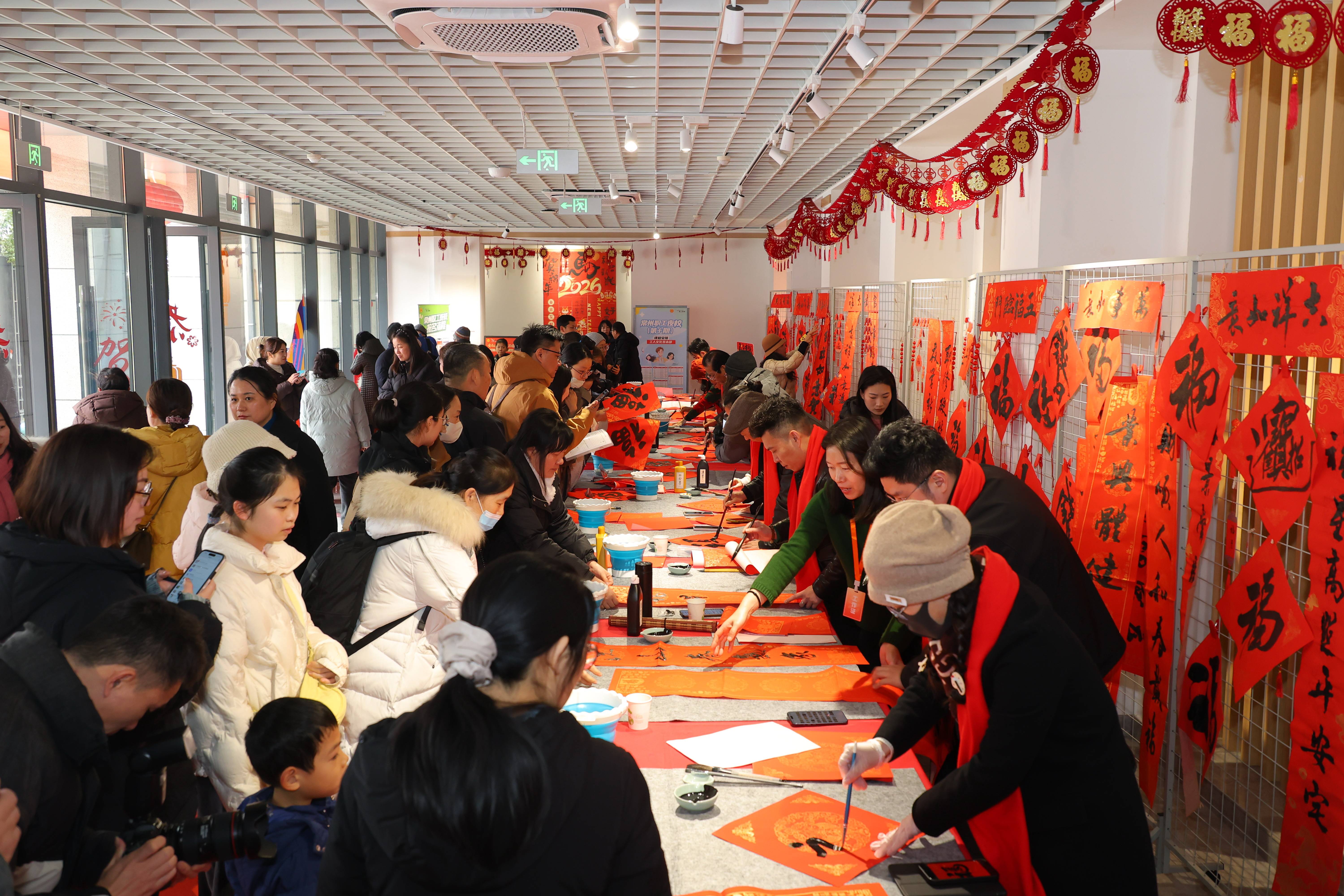 招聘之余,丰富的文化体验活动让现场年味愈发浓厚。在书画创作区,常州职工夜校书画名师王醒、王艳、谢伟、范千里、周清与常州市职工书法家协会名家黄中秋、殷其伟、刘劲草、冯铭晗挥毫泼墨,笔走龙蛇间,一幅幅寓意吉祥的春联、一个个遒劲有力的福字新鲜出炉。“龙腾虎跃事业兴,风调雨顺全家福”“春回大地千山秀,福降人间万户欢”,红纸墨香间承载着对新年的美好期许,市民们排起长队,有序领取这份特殊的“新春祝福”。活动现场共送出福字300个、春联100幅,让市民在感受传统文化魅力的同时,收获满满的年味与暖意。