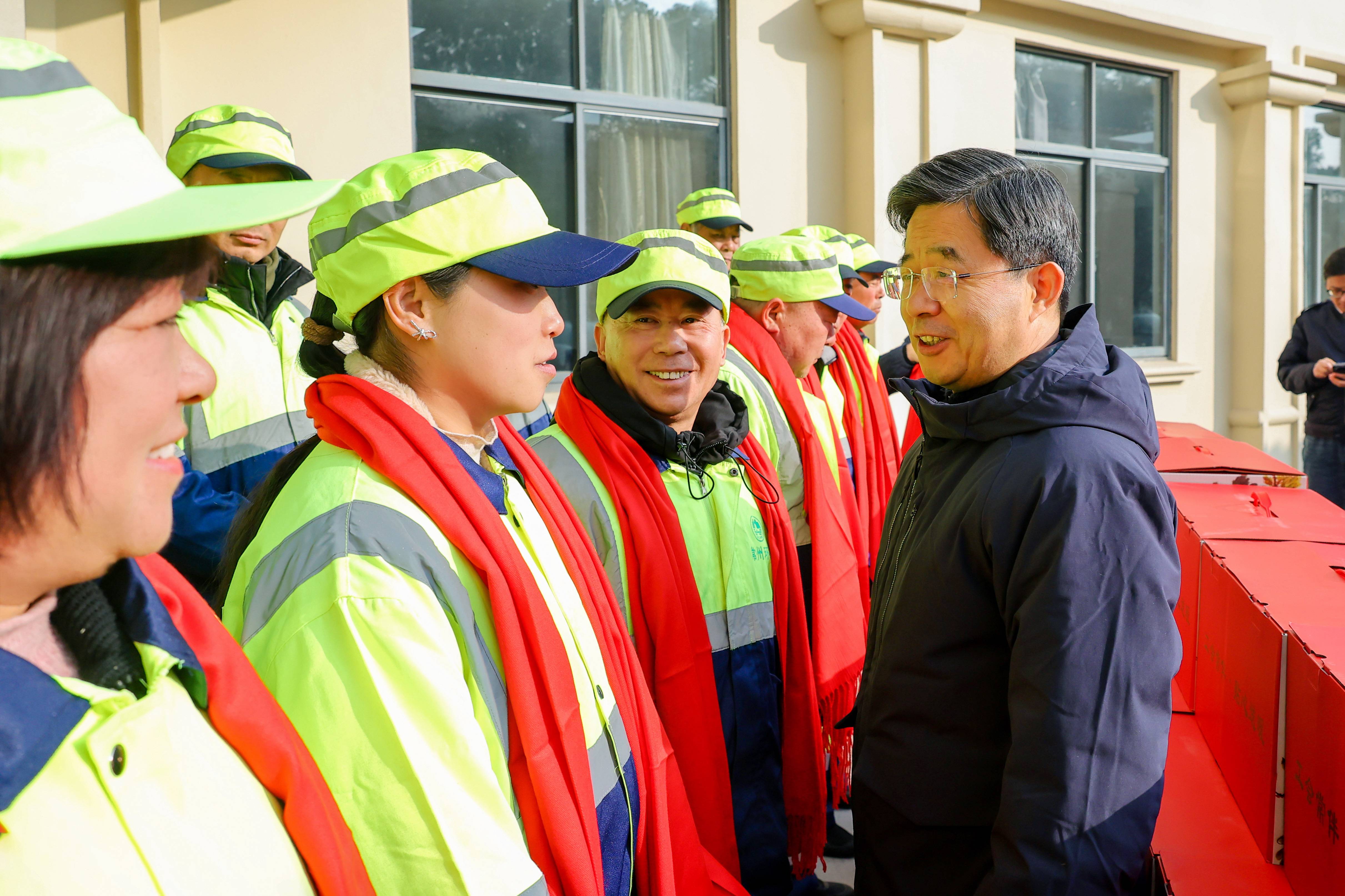 方国强一行首先来到常州市环境卫生管理中心,向环卫工人送上新春祝福,感谢他们长期以来为美丽常州建设付出的辛勤劳动,尤其是最近在雨雪等恶劣天气条件下,依然坚守一线、保障道路整洁畅通。方国强叮嘱大家要关注身体健康,切实做好防寒保暖,并亲手为环卫工人系上红围巾,送上慰问礼包。