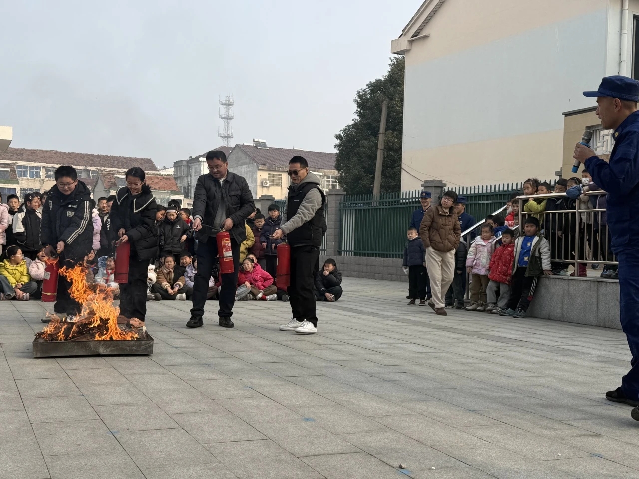 演练现场,民警、交警和消防救援人员通过“理论讲解+实操演练”的方式,为孩子们带来生动的安全课堂。消防环节,救援人员现场演示灭火器“提、拔、握、压”操作要领,设置模拟火情场景,引导孩子们用湿毛巾捂住口鼻,低姿快速有序撤离至安全区域;交通安全环节,交警通过示范交通手势、组织“小司机”模拟通行等趣味形式,直观讲解红绿灯、斑马线等交通标识的作用,培养孩子们遵守交通规则的良好习惯;防拐骗环节,民警化身“陌生人”进行角色扮演,逼真还原搭讪、诱骗场景,让孩子们在亲身体验中认清骗局,掌握拒绝陌生人、紧急求助的正确方法。整个演练过程紧张有序、趣味十足,孩子们积极参与、认真学习,现场互动氛围浓厚。
